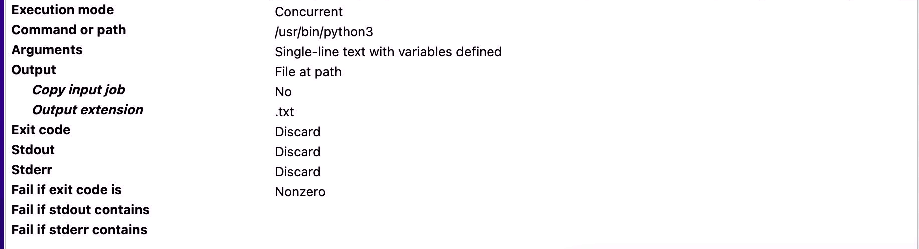 So I have been trying to get the execute command to work for a little bit now and I can't seem to get it right. What I want to do is have my input files (PDF) gets put into the execute command that would trigger my script to run. My script will take the PDF files and string out parts of the text using OCR then lay it out on a json file. I was told to use arguments for my input and output folders ("%1" and "%3"). I also turned on my log and I can see that switch is executing the file path to my script (/Applications/MAMP/htdocs/Arg.py) along with the arguments but I still get output folders that don't have anything inside of them. I see that it's trying to execute something which is why I don't understand why I'm getting blank folders as the output. if anyone has any tips or tricks I can try to get this up and running that would be great!